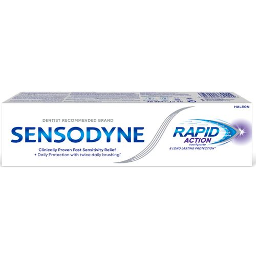 Sensodyne Toothpaste Rapid Action is specifically formulated to provide fast relief for sensitive teeth, delivering noticeable results in just 60 seconds. With its clinically proven formula, it not only alleviates sensitivity but also protects against future discomfort, making it an essential part of your daily oral care routine. Features of Sensodyne Toothpaste Rapid Action Fast-Acting Formula : Offers relief from tooth sensitivity in just 60 seconds. Long-Lasting Protection : Helps prevent sensitivity from returning with regular use. Fluoride Content : Provides cavity protection for healthier teeth. Why Choose Sensodyne Toothpaste Rapid Action? This toothpaste is ideal for individuals suffering from sensitive teeth, offering quick relief and daily protection. Brush twice daily to maintain optimal oral health and enjoy your favorite foods without discomfort. FAQ Q: How quickly does Sensodyne provide relief? A: It provides relief in just 60 seconds. Q: Is it safe for daily use? A: Yes,
