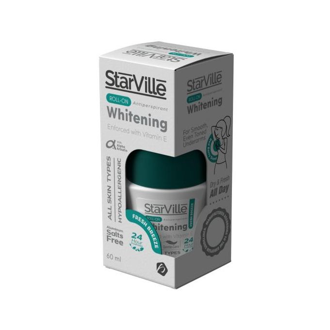 Starville Whitening Roll On Fresh Breeze offers effective 24-hour protection against body odor and excessive sweating. This roll-on formula is enriched with alpha-arbutin , vitamin C , and licorice extract to lighten dark spots and underarm pigmentation, promoting an even skin tone. It’s suitable for both men and women and is free from aluminum salts. Enhanced with Vitamin E and Panthenol , it helps improve skin texture while reducing redness and inflammation caused by hair removal. Key Benefits 24-Hour Protection: Effectively combats body odor and sweat. Skin Brightening: Lightens dark spots and evens skin tone. Soothing Ingredients: Reduces redness and irritation. Gender Neutral: Suitable for all users. Aluminum-Free: Safer alternative for daily use. How to Use Apply to clean, dry underarms after bathing.